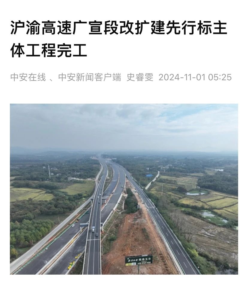 近日,安徽水利承建的滬渝國家高速公路安徽省廣德至宣城段改擴建工程先行開(kāi)工段項目主體工程全部完成,項目進(jìn)展受到中安在線(xiàn)、新安晚報、學(xué)習強國等媒體關(guān)注報道。