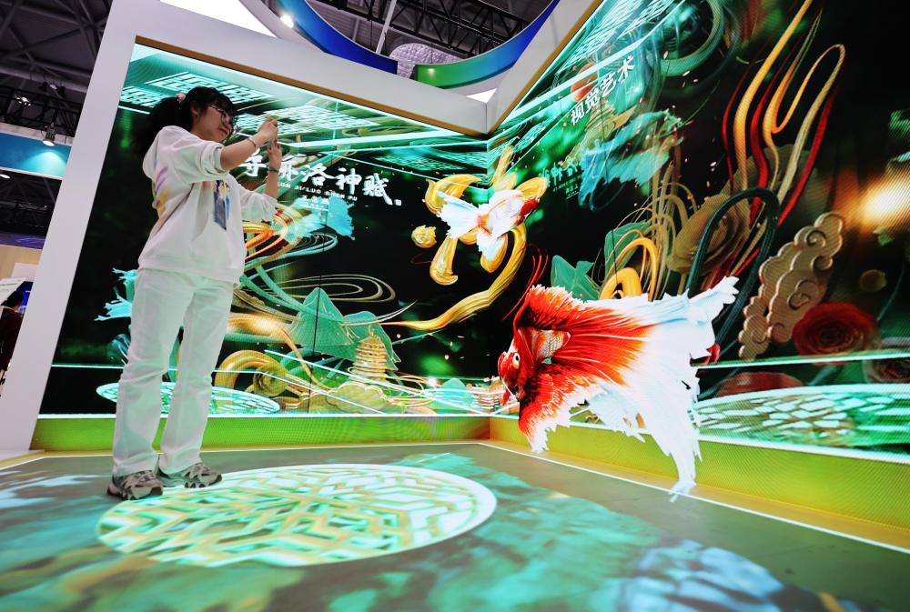 ??2024年4月1日,在安徽合肥舉辦的2024國際顯示技術(shù)大會(huì )上,一名觀(guān)眾體驗京東方展出的裸眼3D快速拆裝折角屏。