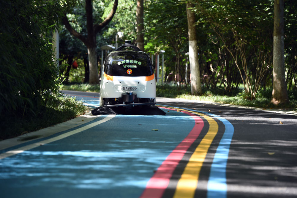 ??2022年6月24日,智能無(wú)人清掃機器人在安徽合肥一處公園清掃路面。