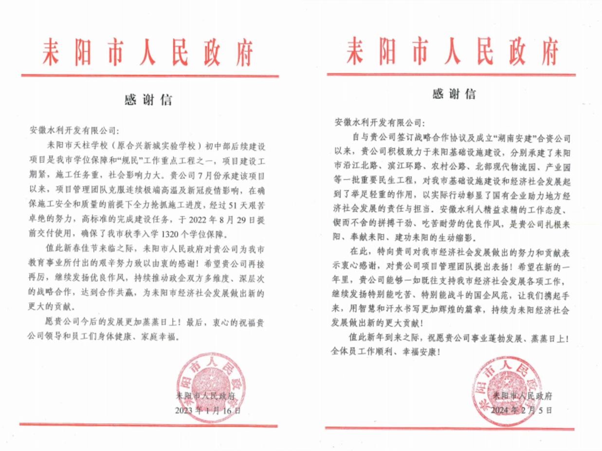 與客戶(hù)同心,合作共贏(yíng)。2024年,安徽水利南方分公司積極融入地方發(fā)展大局,推動(dòng)耒陽(yáng)市委市政府與安徽水利高層開(kāi)展互動(dòng)交流6次,建立起良好互信關(guān)系。在此期間,公司還分別與耒陽(yáng)市人民政府、耒陽(yáng)經(jīng)濟開(kāi)發(fā)區管理委員會(huì )簽訂了戰略合作框架協(xié)議,與耒陽(yáng)市城市和農村建設投資集團有限公司合資成立了湖南安建建設開(kāi)發(fā)有限公司,建立了政企合作的紐帶。合資公司的成立為助力耒陽(yáng)基礎設施建設,助推耒陽(yáng)經(jīng)濟發(fā)展,帶動(dòng)當地人口就業(yè),增加地方財政稅收等方面貢獻了“湖南安建”的力量,并順利取得建筑工程施工總承包貳級和市政公用工程施工總承包貳級資質(zhì)資質(zhì)。