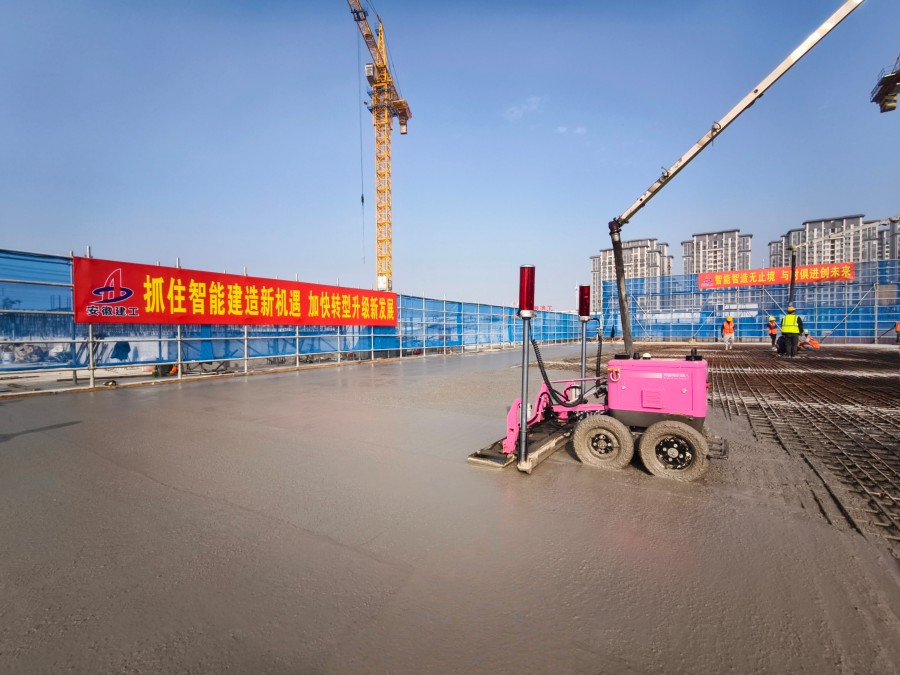 項目采用自主開(kāi)發(fā)的GNSS全自動(dòng)導航系統、高精度激光識別測量和實(shí)時(shí)控制技術(shù),實(shí)現全天候無(wú)人化自動(dòng)施工、自動(dòng)導航、自主規劃路徑以及多機調度。與傳統人工操作相比,這位“新工友”能確?;炷潦┕ひ淮纬尚?,實(shí)現超過(guò)95%的平整度、水平度合格率,人機配合下初凝平整度達±5mm,同時(shí)可確?;炷恋拿軐?shí)性和抗滲性,有效延長(cháng)建筑的使用壽命,工效可達160㎡/h以上,節約人力30%以上。