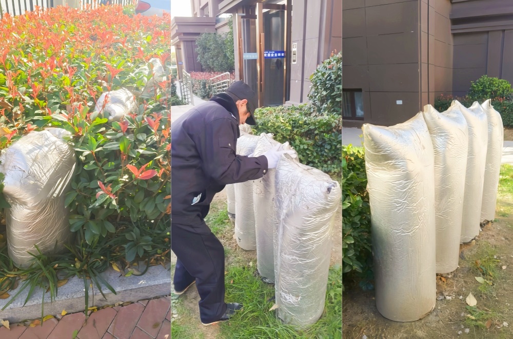 霜凍、寒潮如冷酷殺手,威脅著(zhù)綠化植物的健康與景觀(guān)效果。物業(yè)公司綠化師傅們妙招頻出,在精心落實(shí)日??茖W(xué)養護之余,對新植或不耐寒樹(shù)木重點(diǎn)呵護,逐一為樹(shù)干刷上潔白防護漆,宛如給樹(shù)木穿上“防護服”;部分嬌弱植株則裹上防寒布,變身冬日“暖寶寶”,靜靜守護,只待來(lái)年春歸時(shí),重煥滿(mǎn)園蔥郁。
