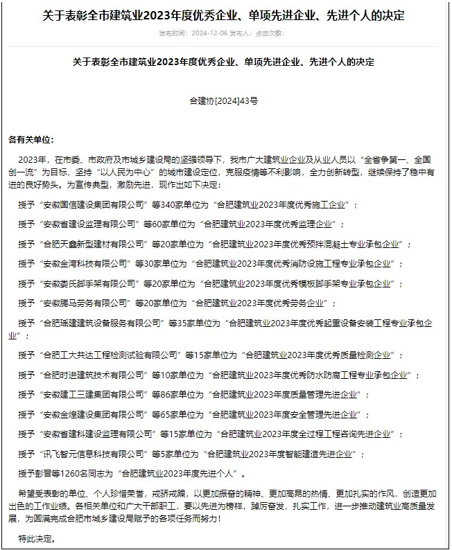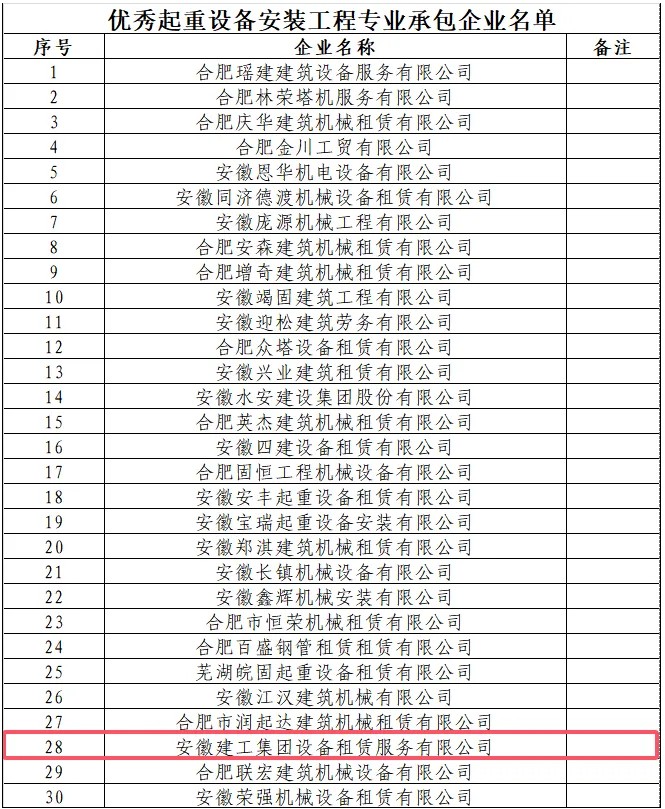 喜事連連,在合肥市建筑工程協(xié)會(huì )發(fā)布的《關(guān)于表彰全市建筑業(yè)2023年度優(yōu)秀企業(yè)、單項先進(jìn)企業(yè)、先進(jìn)個(gè)人的決定》中,建工設備租賃獲得“合肥建筑業(yè)2023年度優(yōu)秀起重設備安裝工程專(zhuān)業(yè)承包企業(yè)”稱(chēng)號。