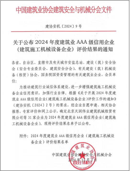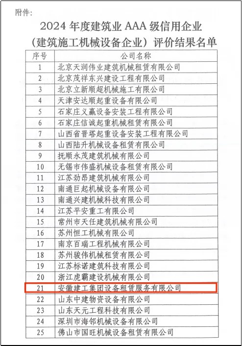 近日,中國建筑業(yè)協(xié)會(huì )建筑安全與機械分會(huì )公布了2024年度建筑業(yè)AAA級信用企業(yè)(建筑施工機械設備企業(yè))評價(jià)結果,建工設備租賃成功入選,成為安徽省唯一一家“2024 年度建筑業(yè)AAA級信用企業(yè)(建筑施工機械設備企業(yè))”。