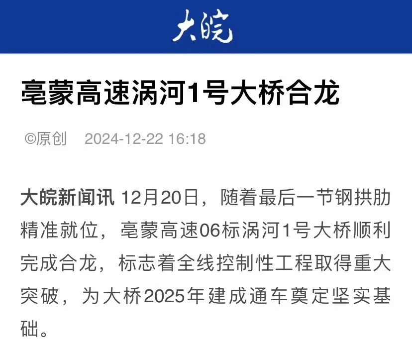 12月20日,隨著(zhù)最后一節鋼拱肋精準就位,安徽水利亳蒙高速06標渦河1號大橋順利完成合龍,受到大皖新聞、亳州市交通運輸局官微等關(guān)注報道。