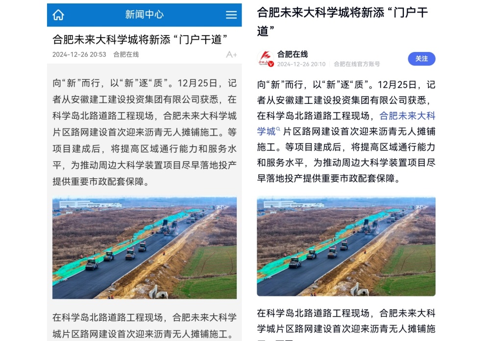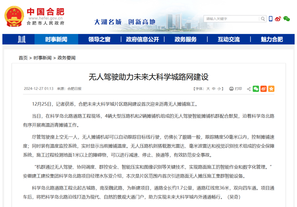 媒體聚焦丨合肥市人民政府官網(wǎng)、《合肥日報》等媒體報道建工建投科學(xué)島北路項目引入無(wú)人攤壓技術(shù)!