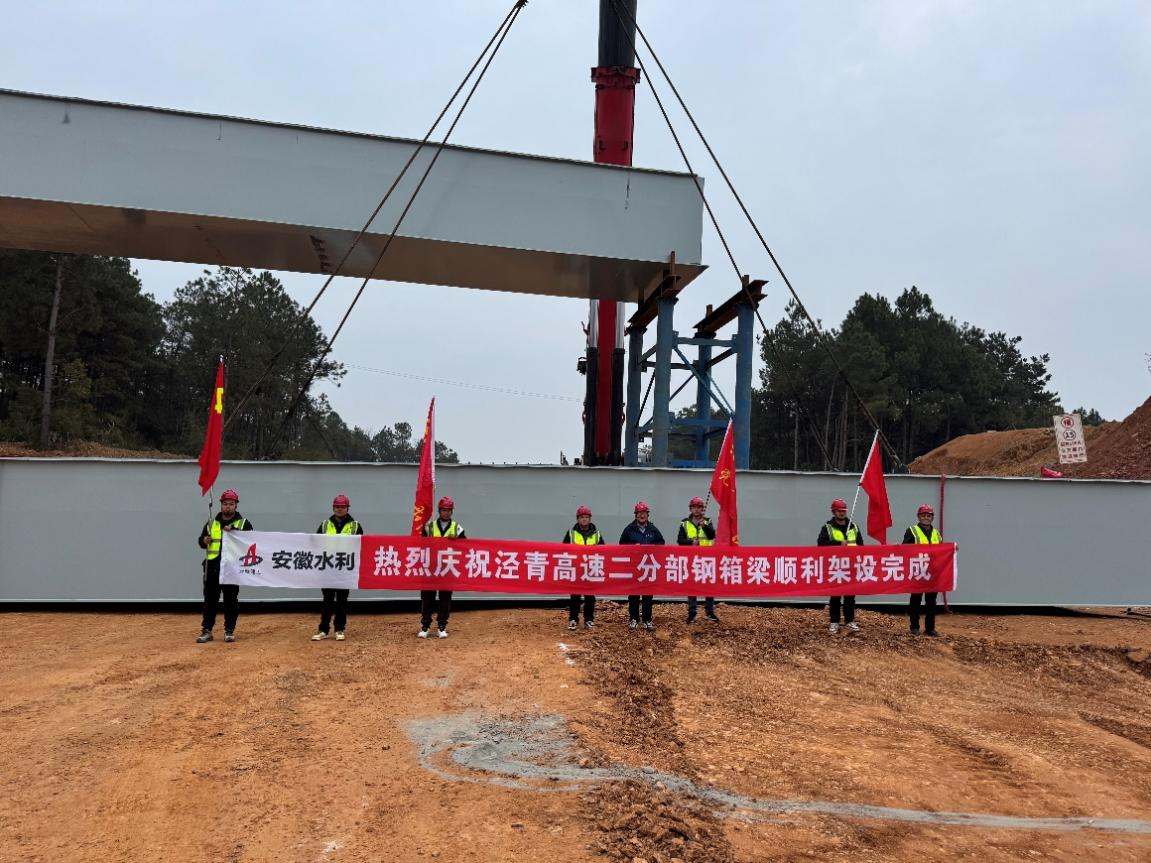12月25日下午,隨著(zhù)K12+860車(chē)行天橋最后一節鋼箱梁安裝就位,安徽水利涇青高速02標鋼箱梁順利架設完成。