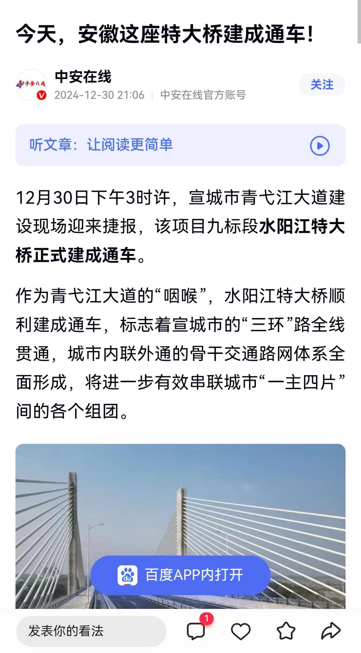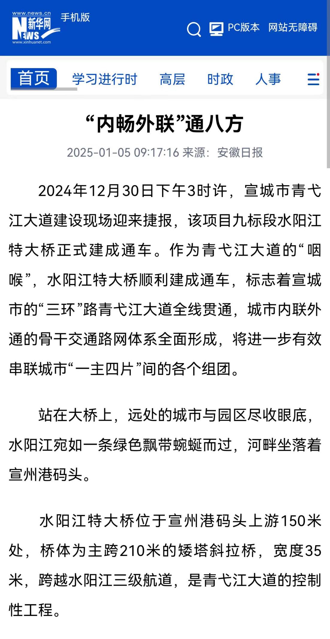 近日,建工路港承建的宣城市青弋江大道水陽(yáng)江特大橋正式建成通車(chē),受到安徽日報紙媒、新華網(wǎng)、中安在線(xiàn)等多個(gè)主流媒體關(guān)注報道。
