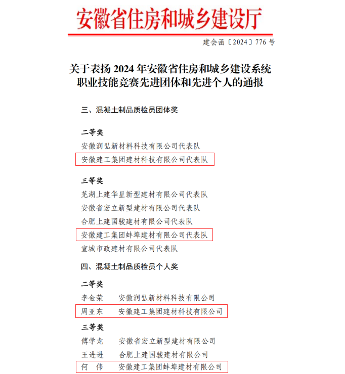 近日,由安徽省住房和城鄉建設廳主辦的2024年安徽省住房和城鄉建設系統職業(yè)技能競賽——混凝土制品質(zhì)檢員競賽成績(jì)公布。建工建材代表隊和建工蚌埠建材代表隊分別榮獲團體獎二等獎和三等獎,周亞?wèn)|、何偉分別獲得個(gè)人二等獎和三等獎。