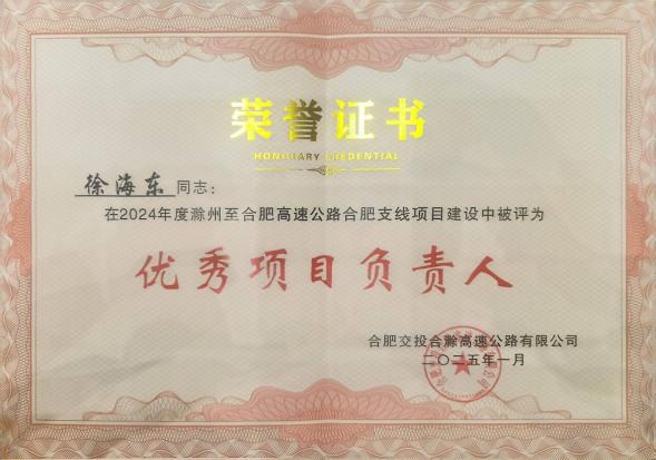 近日,合肥交投合滁高速公路舉辦2024年度總結大會(huì )暨表彰大會(huì )。滁合支線(xiàn)項目榮獲2024年度“先進(jìn)集體”稱(chēng)號,徐海東同志榮獲“優(yōu)秀項目負責人”稱(chēng)號,張興強、王盛楠、耿貝貝同志榮獲先進(jìn)個(gè)人稱(chēng)號。