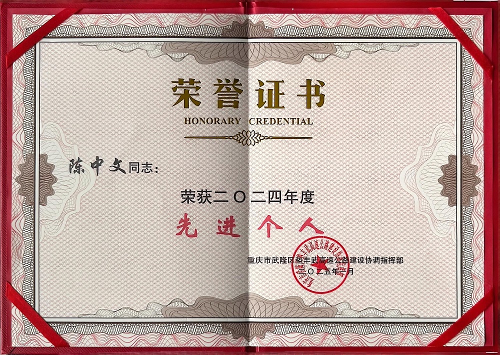 建工建投集團重慶墊豐武高速TJ09標項目榮獲“2024年度先進(jìn)集體”稱(chēng)號,陳中文同志榮獲“2024年度先進(jìn)個(gè)人”稱(chēng)號。