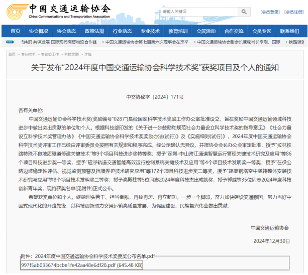 “中國交通運輸協(xié)會(huì )科學(xué)技術(shù)獎”是由國家科學(xué)技術(shù)獎勵工作辦公室批準設立,旨在獎勵中國交通運輸領(lǐng)域中做出突出貢獻的單位和個(gè)人,是國家科技獎勵的重要組成部分,被業(yè)內譽(yù)為“全國交通運輸行業(yè)最高科技獎”。