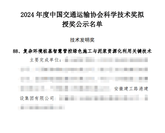 近日,中國交通運輸協(xié)會(huì )公布了2024年度科學(xué)技術(shù)獎獲獎名單,建工路港“復雜環(huán)境樁基智慧管控綠色施工與泥漿資源化利用關(guān)鍵技術(shù)”榮獲技術(shù)發(fā)明獎一等獎。