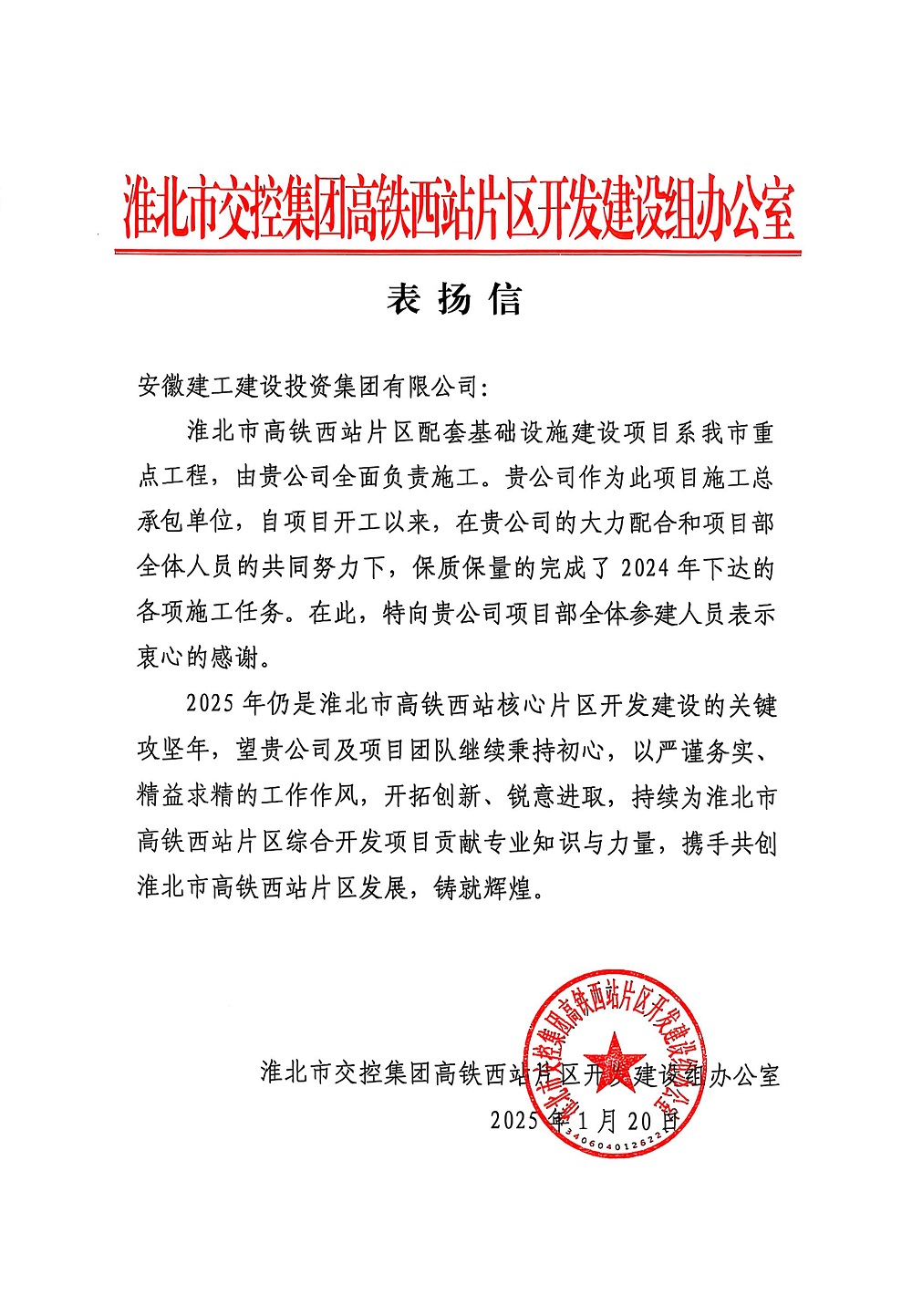 淮北高鐵西站綜合開(kāi)發(fā)項目業(yè)主單位淮北市交控集團高鐵西站片區開(kāi)發(fā)建設組辦公室來(lái)信表?yè)P:自項目開(kāi)工以來(lái),在貴公司的大力配合和項目部全體人員的共同努力下,保質(zhì)保量地完成了2024年下達的各項施工任務(wù)。