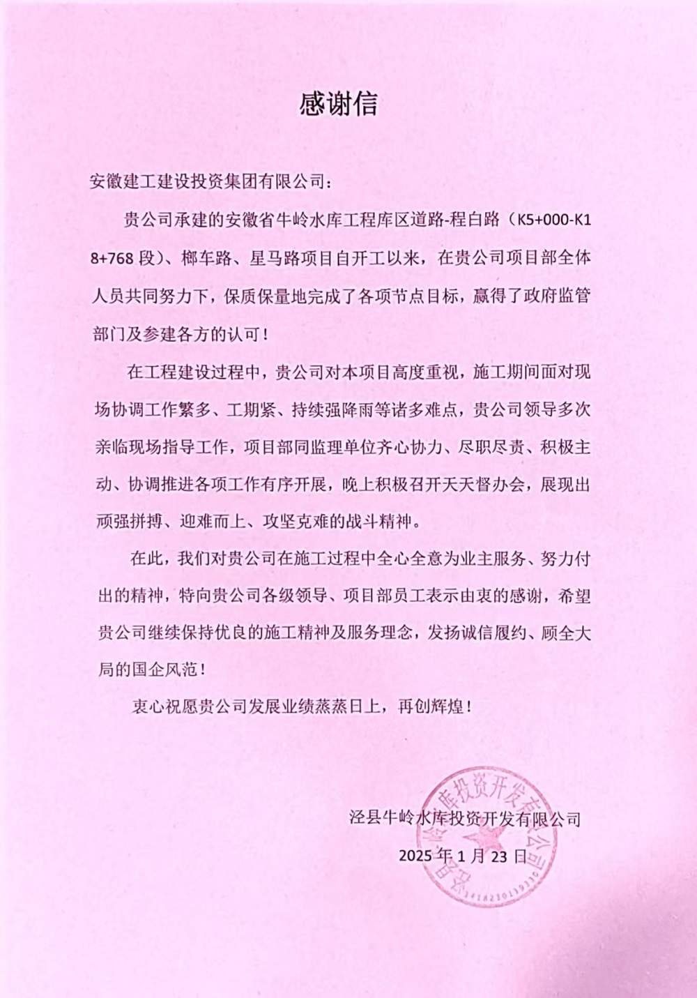 牛嶺水庫工程庫區道路-程白路、榔車(chē)路、星馬路項目業(yè)主單位牛嶺水庫投資開(kāi)發(fā)有限公司來(lái)信表?yè)P:在貴公司項目部全體人員的共同努力下,保質(zhì)保量地完成了各項節點(diǎn)目標,贏(yíng)得了政府監管部門(mén)及參建各方的認可!在工程建設過(guò)程中,貴公司對本項目高度重視,施工期間面對現場(chǎng)協(xié)調工作繁多、工期緊、持續強降雨等諸多難點(diǎn),貴公司領(lǐng)導多次親臨現場(chǎng)指導工作,項目部同監理單位齊心協(xié)力、盡職盡責、積極主動(dòng)、協(xié)調推進(jìn)各項工作有序開(kāi)展,晚上積極召開(kāi)天天督辦會(huì ),展現出頑強拼搏、迎難而上、攻堅克難的戰斗精神。