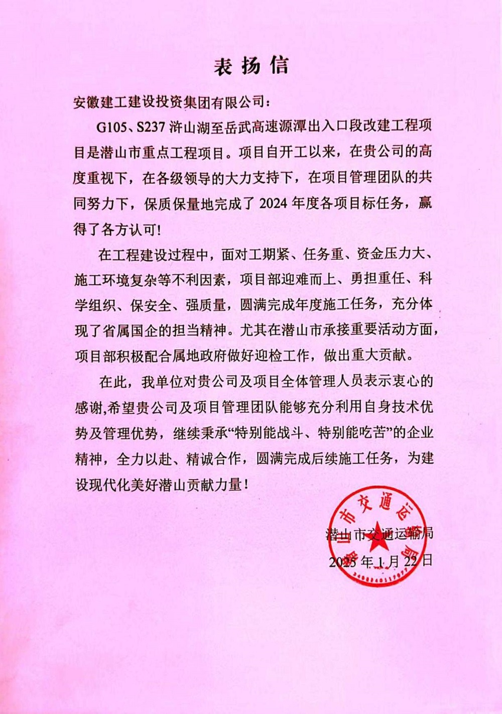 G105、S237滸山湖至岳武高速源潭出入口段改建工程業(yè)主單位潛山市交通運輸局來(lái)信表?yè)P:項目部面對工期緊、任務(wù)重、資金壓力大、施工環(huán)境復雜等不利因素,項目部迎難而上、勇?lián)厝?、科學(xué)組織、保安全、強質(zhì)量,圓滿(mǎn)完成年度施工任務(wù),充分體現了省屬?lài)蟮膿斁?。尤其在潛山市承接重要活?dòng)方面項目部積極配合屬地政府做好迎檢工作,做出重大貢獻。