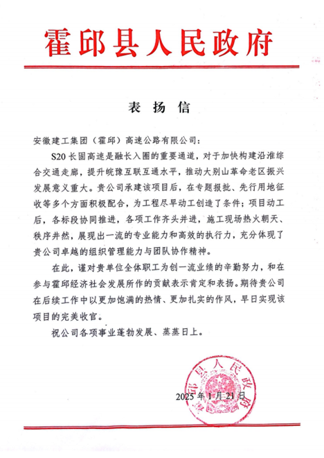 1月24日,建工投資S20長(cháng)固高速霍邱至皖豫界段項目喜獲霍邱縣人民政府通報表?yè)P,充分肯定了項目公司在前期工作推進(jìn)方面取得的豐碩成果。