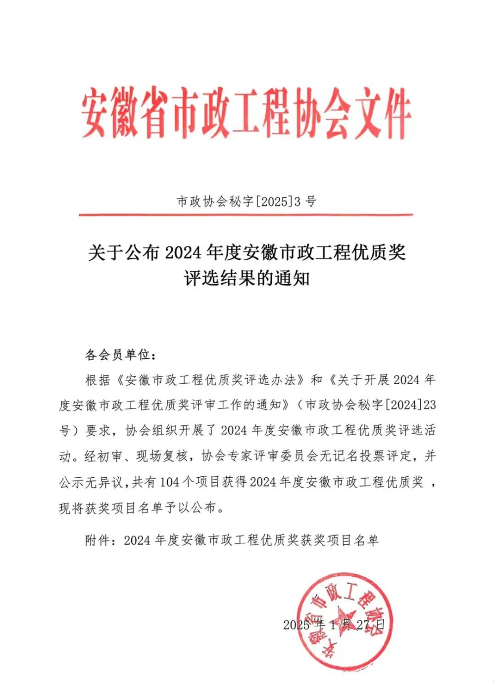 2025年1月27日,安徽省市政工程協(xié)會(huì )發(fā)布文件《關(guān)于公布2024年度安徽市政工程優(yōu)質(zhì)獎評選結果的通知》,由建工建投集團主申報的肥東經(jīng)開(kāi)區火龍山路(魏武路-東方大道)建設工程,白馬山路(學(xué)林路-關(guān)井路)等三條道路建設工程,新站高新區青龍山路(梅沖湖路-荃湖北路)道路工程,新站高新區鶴翔湖路等五條路工程施工、城市排水管網(wǎng)改造(二期)工程,靈璧縣迎賓大道(鳳河至汴河路段)、奇石大道(濱河路至凌山路段),汴河路(迎賓大道至薄山路段),合廬產(chǎn)業(yè)新城龍橋路等8條市政道路工程施工-2標段,靈璧縣城市路網(wǎng)PPP項目一期(調入部分)工程-鳳山大道等共計8個(gè)項目榮列獲獎名單!