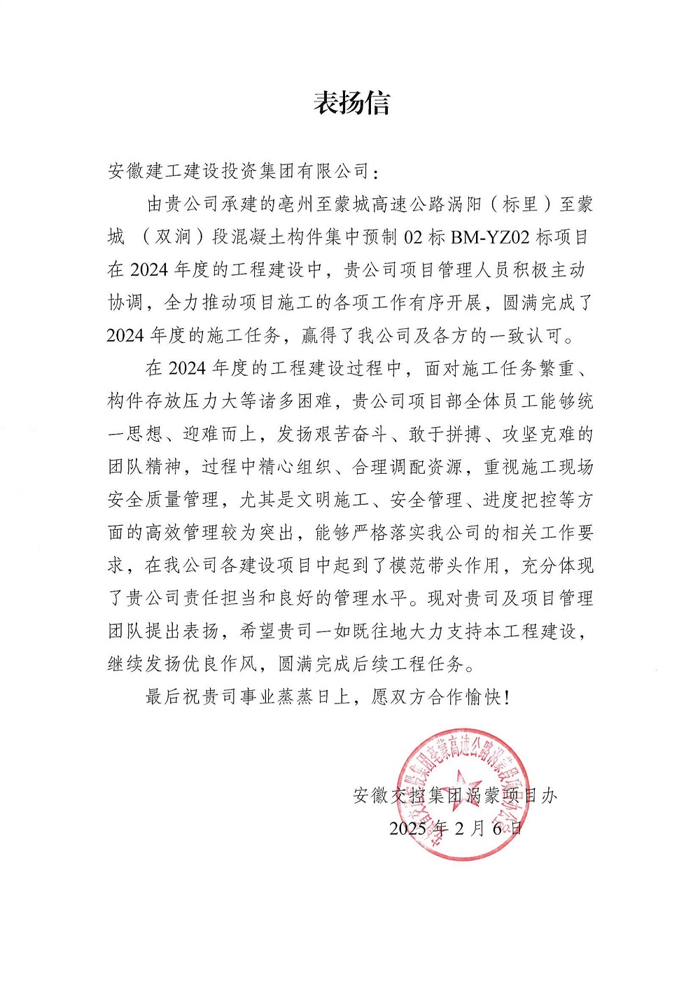 表?yè)P信指出,亳蒙預制02標項目在2024年度的工程建設過(guò)程中,面對施工任務(wù)繁重、構件存放壓力大等諸多困難,項目部全體員工能夠統一思想、迎難而上,發(fā)揚艱苦奮斗、敢于拼搏、攻堅克難的團隊精神,過(guò)程中精心組織、合理調配資源,重視施工現場(chǎng)安全質(zhì)量管理,尤其是文明施工、安全管理、進(jìn)度把控等方面的高效管理較為突出,能夠嚴格落實(shí)業(yè)主單位的相關(guān)工作要求,在各建設項目中起到了模范帶頭作用,項目管理人員積極主動(dòng)協(xié)調,全力推動(dòng)項目施工的各項工作有序開(kāi)展,圓滿(mǎn)完成了2024年度的施工任務(wù),贏(yíng)得了業(yè)主單位及各方的一致認可。