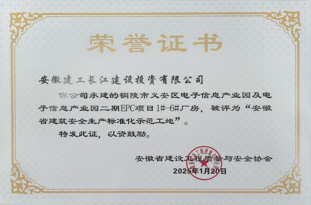 喜報!長(cháng)江建投銅陵市義安區電子信息產(chǎn)業(yè)園及電子信息產(chǎn)業(yè)園二期 EPC 項目1#-6#廠(chǎng)房獲評2024年度第四批“安徽省建筑安全生產(chǎn)標準化工地”稱(chēng)號