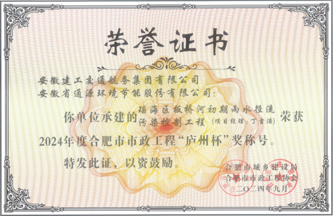 近日,安徽省市政工程協(xié)會(huì )公布了2024年度安徽省市政工程優(yōu)質(zhì)獎獲獎項目名單,由公司承建的瑤海區板橋河初期雨水徑流污染控制工程喜獲2024年度“安徽市政工程優(yōu)質(zhì)獎”。