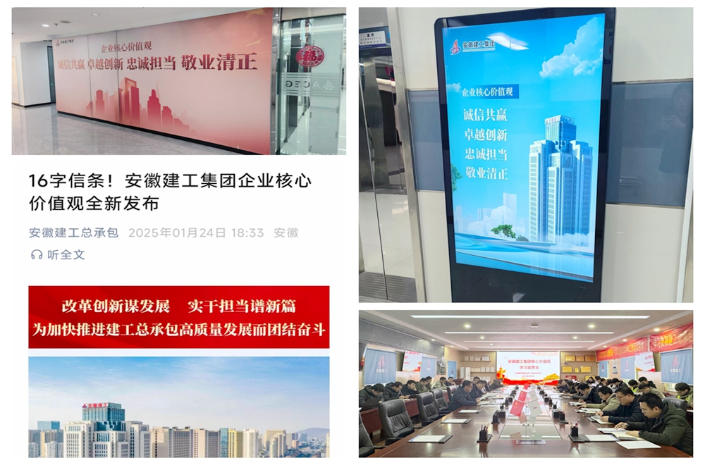 創(chuàng )新載體,增強學(xué)習宣貫實(shí)效。公司堅持“線(xiàn)上線(xiàn)下”雙管齊下,充分運用官微、官網(wǎng)等線(xiàn)上平臺,第一時(shí)間推送《16字信條!安徽建工集團企業(yè)核心價(jià)值觀(guān)全新發(fā)布》學(xué)習資料,將核心價(jià)值觀(guān)融入公司宣傳圖標;線(xiàn)下利用宣傳欄、電子屏、海報等載體,廣泛宣傳營(yíng)造氛圍,增強學(xué)習的吸引力感染力。