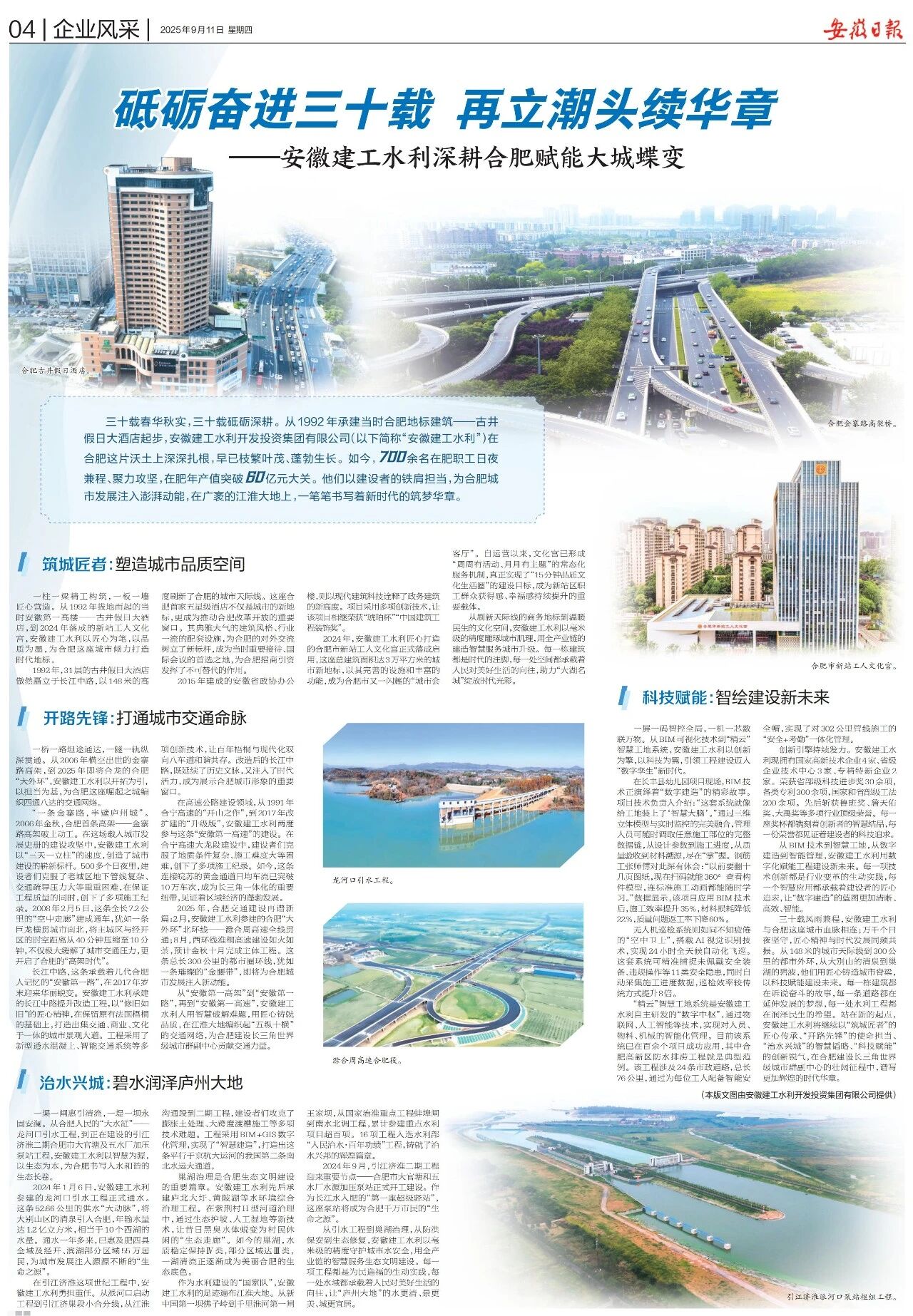 三十載風(fēng)雨兼程,安徽建工水利與合肥這座城市血脈相連;萬(wàn)千個(gè)日夜堅守,匠心精神與時(shí)代發(fā)展同頻共振。從148米的城市天際線(xiàn)到300公里的都市外環(huán),從大別山的清泉到巢湖的碧波,他們用匠心鑄造城市脊梁,以科技賦能建設未來(lái)。每一棟建筑都在訴說(shuō)奮斗的故事,每一條道路都在延伸發(fā)展的夢(mèng)想,每一處水利工程都在潤澤民生的希望。站在新的起點(diǎn),安徽建工水利將繼續以“筑城匠者”的匠心傳承、“開(kāi)路先鋒”的使命擔當、“治水興城”的智慧韜略、“科技賦能”的創(chuàng )新銳氣,在合肥建設長(cháng)三角世界級城市群副中心的壯闊征程中,譜寫(xiě)更加輝煌的時(shí)代華章。