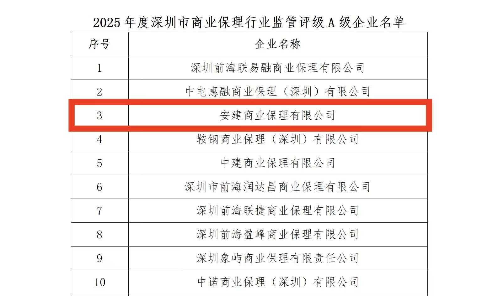 近日,深圳市地方金融管理局正式發(fā)布了2025年度深圳市商業(yè)保理行業(yè)監管評級結果的公告。安建保理在此次316家參評商業(yè)保理公司中位列第三名,獲得最高評級A級。