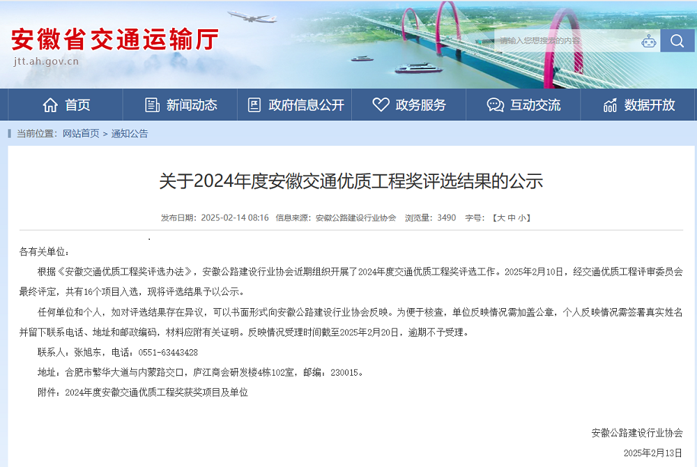 近日,安徽公路建設行業(yè)協(xié)會(huì )發(fā)布通知文件,公布2024年度安徽交通優(yōu)質(zhì)工程獎評選結果及單位名單,共16個(gè)工程項目獲獎。