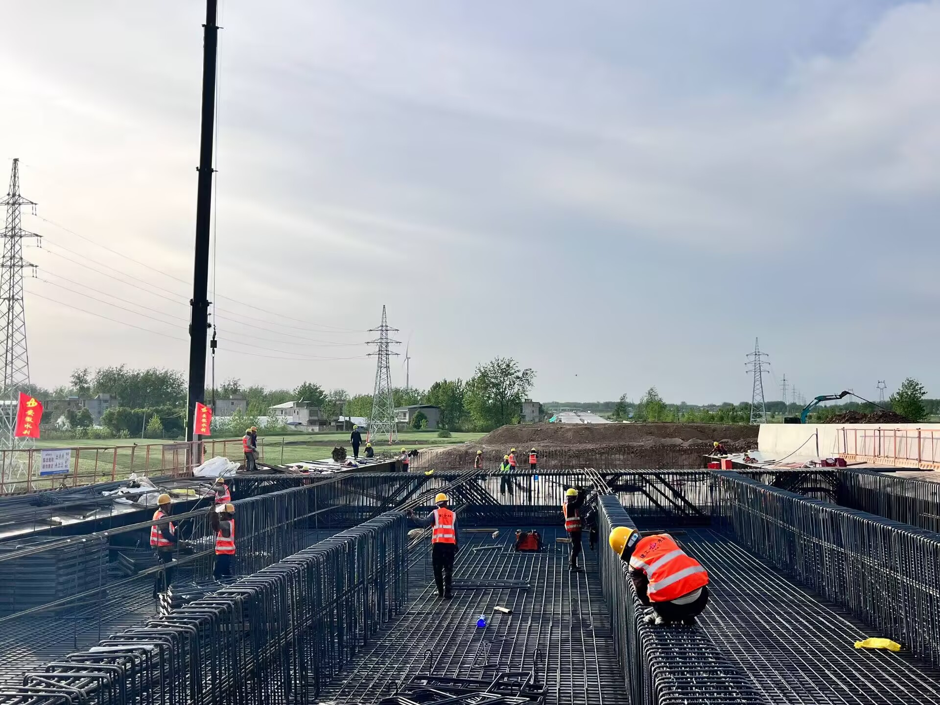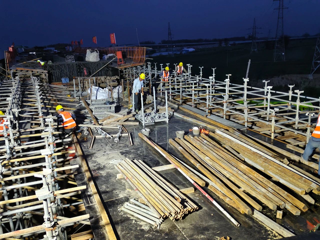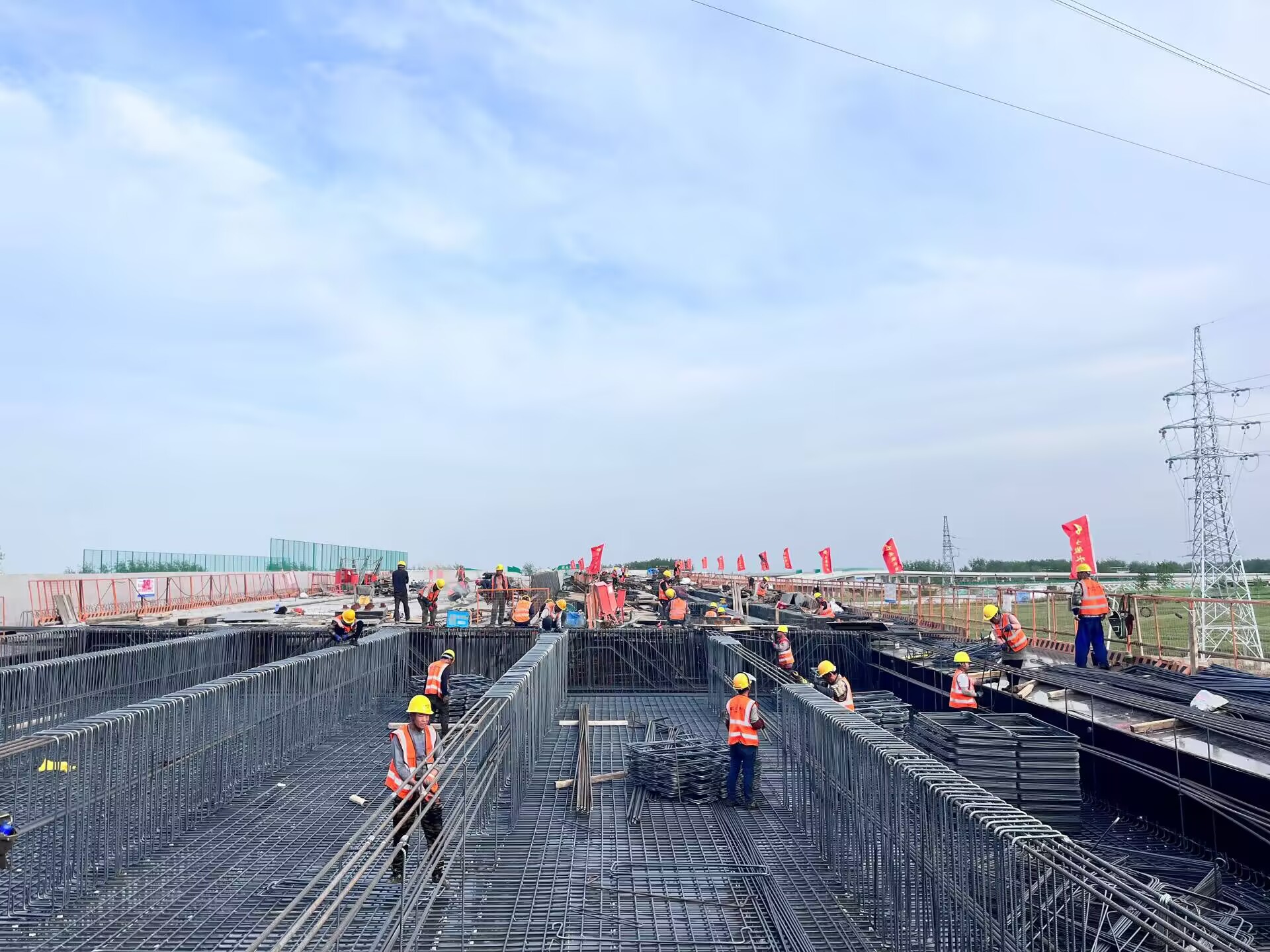 前期由遷改工原因,潁臨高速路基05標公橋樞紐內D匝道橋和阜(陽(yáng))淮(濱)分離立交橋的一聯(lián)二跨連續箱梁現澆、一聯(lián)四跨連續箱梁現澆、一跨25米預制箱梁安裝(均包括樁基和下部結構)未能開(kāi)工。在經(jīng)過(guò)項目多次積極主動(dòng)聯(lián)系業(yè)主單位及遷改單位,積極配合遷改施工情況下,2025年3月1日影響項目全線(xiàn)貫通的35KV高壓桿線(xiàn)順利拆除完成。項目隨后立即組織編排施工計劃,倒排工期,合理配置人材機,迅速啟動(dòng)樁基施工,過(guò)程中加強管理及時(shí)調整施工計劃,增加人員設備投入,經(jīng)過(guò)近一個(gè)半月的日夜奮斗,目前樁基下部及梁板安裝已完成,現場(chǎng)施工體系已迅速完成轉換,進(jìn)入橋面系及現澆箱梁施工階段,經(jīng)過(guò)與地方交通局及各級主管單位的溝通協(xié)調,項目及時(shí)解決D匝道橋現澆段跨318省道門(mén)洞搭設及省道兩側限高通行交通管制問(wèn)題,確保施工任務(wù)能按時(shí)完成。