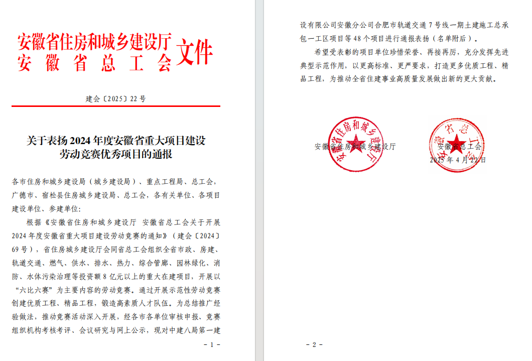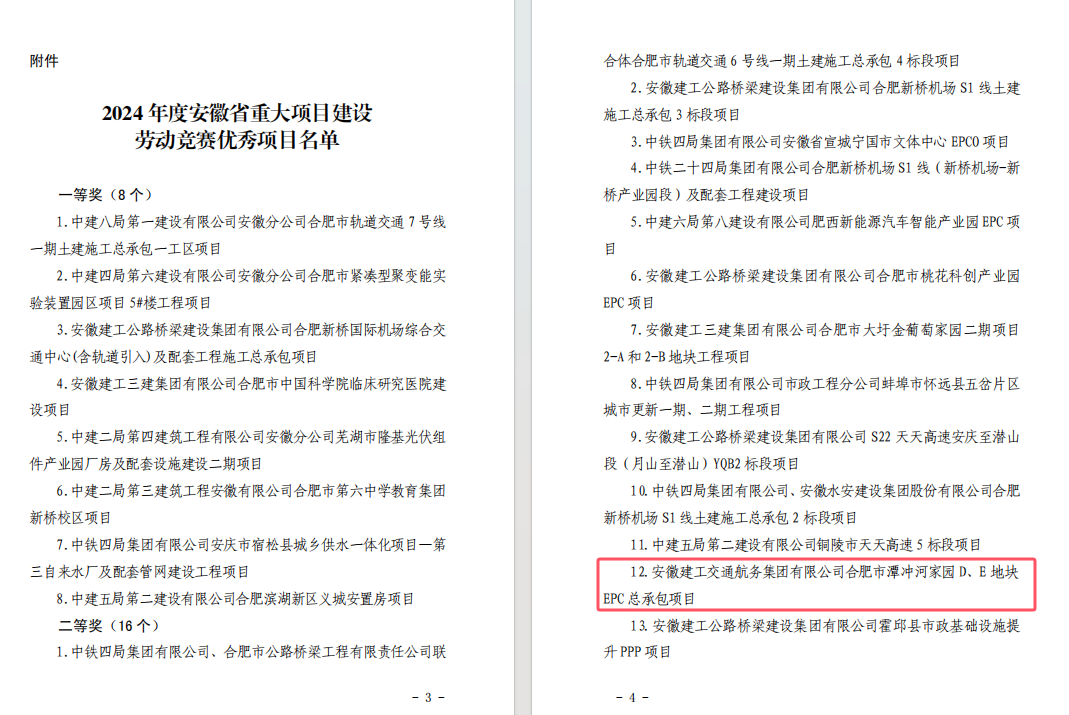 近日,安徽省住房和城鄉建設廳、安徽省總工會(huì )聯(lián)合發(fā)布《關(guān)于表?yè)P 2024 年度安徽省重大項目建設勞動(dòng)競賽優(yōu)秀項目的通報》,公司潭沖河家園 D、E 地塊 EPC 總承包項目和徐淮阜高速宿州段路基工程 02 標項目表現突出,成功入選優(yōu)秀項目名單。