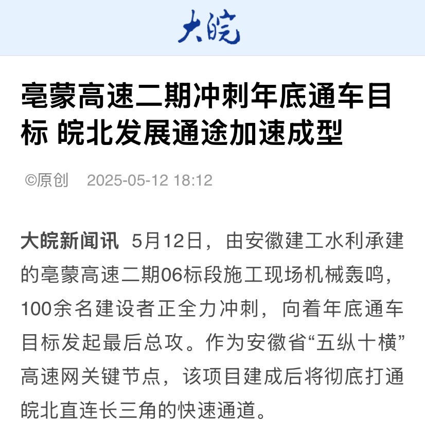 5月12日,建工水利亳蒙高速二期06標施工現場(chǎng)機械轟鳴,100余名建設者正夜以繼日、全力沖刺,向著(zhù)年底全線(xiàn)通車(chē)目標發(fā)起最后總攻。作為安徽省“五縱十橫”高速網(wǎng)關(guān)鍵節點(diǎn),項目建成后將徹底打通皖北直連長(cháng)三角的快速通道。此前,該項目建設期間,多次受到安徽日報、大皖新聞、中安在線(xiàn)等主流媒體關(guān)注報道。