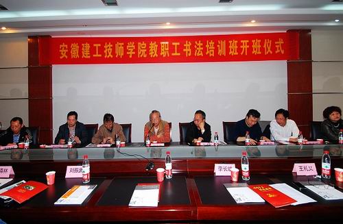 10月23日上午,安徽建工技師學(xué)院隆重舉行書(shū)法培訓班開(kāi)班儀式。省國資委副主任、常務(wù)副書(shū)記吳經(jīng)華,省書(shū)法家協(xié)會(huì )名譽(yù)主席張良勛,省書(shū)法名家余國松、傅愛(ài)國、張兆玉、史培剛,劉重秋、潘偉城,安徽建工集團公司領(lǐng)導李長(cháng)斌、王禮義等出席了開(kāi)班儀式,安徽建工技師學(xué)院領(lǐng)導、學(xué)院中層管理人員及書(shū)法愛(ài)好者參加了開(kāi)班儀式。