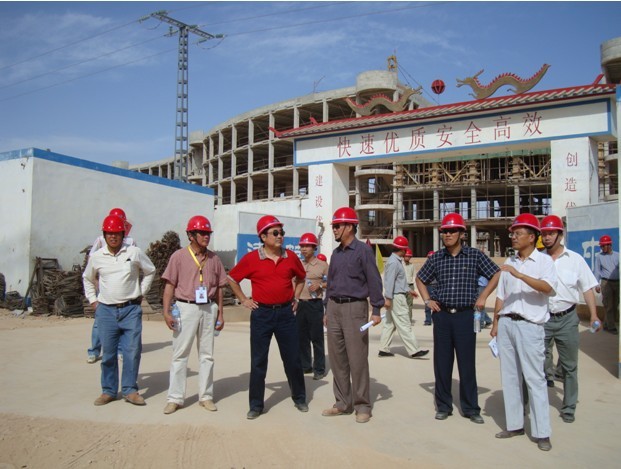 7月7日,胡運成董事長(cháng)在省二建公司總經(jīng)理費瑞林、海外公司總經(jīng)理吳康、省一建公司總經(jīng)理范毓慶以及駐阿經(jīng)理部領(lǐng)導班子的陪同下,不顧一天的旅途勞累,克服時(shí)差影響,冒著(zhù)酷暑走訪(fǎng)了康斯坦丁大學(xué)城各施工項目部,詳盡了解了項目施工進(jìn)展情況,并與現場(chǎng)施工人員進(jìn)行了親切交談。    7月8日、9日,胡董事長(cháng)在現場(chǎng)參加了兩次康大項目專(zhuān)題座談交流會(huì )。會(huì )上,各項目部負責人匯報了項目各標段生產(chǎn)管理情況,吳福軍同志就康大項目整體現狀做了系統的總結匯報。聽(tīng)取匯報后,海外公司總經(jīng)理吳康同志作了發(fā)言。他對項目經(jīng)理部目前的工作進(jìn)度、職工精神面貌給予了肯定,并著(zhù)重就圖紙設計、水泥供應、設備協(xié)調、人員補充、隊伍建設等施工管理的具體問(wèn)題提出了意見(jiàn)和要求。