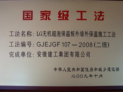 3月29日,國家級工法成果推廣與經(jīng)驗交流研討會(huì )在北京召開(kāi)。原建設部副部長(cháng)、中國建筑業(yè)協(xié)會(huì )會(huì )長(cháng)鄭一軍,住房和城鄉建設部總經(jīng)濟師李秉仁等出席研討會(huì )。會(huì )議向獲得2007年-2008年度國家級工法的完成單位頒發(fā)了獎牌和證書(shū)。安徽建工集團有限公司編制的《LG無(wú)機超泡保溫板外墻外保溫施工工法》(GJEJEF107-2008)被評為國家級工法,此次國家級工法的申報成功,不僅是集團公司堅持技術(shù)創(chuàng )新取得又一突破,更為集團公司特級資質(zhì)就位奠定了一定的基礎。