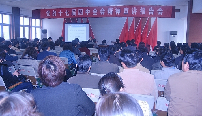 4月1日上午,省國資委黨的十七屆四中全會(huì )精神宣講團副團長(cháng)、組宣處調研員趙良耿帶隊來(lái)到安徽建工集團宣講,宣講團成員、淮南職業(yè)技術(shù)學(xué)院思政部主任、副教授朱友強作了題為《認真學(xué)習十七屆四中全會(huì )精神全面推進(jìn)我省國有企業(yè)黨建工作》的專(zhuān)題報告。集團公司領(lǐng)導,所屬各單位領(lǐng)導班子成員、黨群部門(mén)負責人,集團機關(guān)全體職工參加報告會(huì )。報告會(huì )由集團公司黨委工作部主任吳曉伍主持。