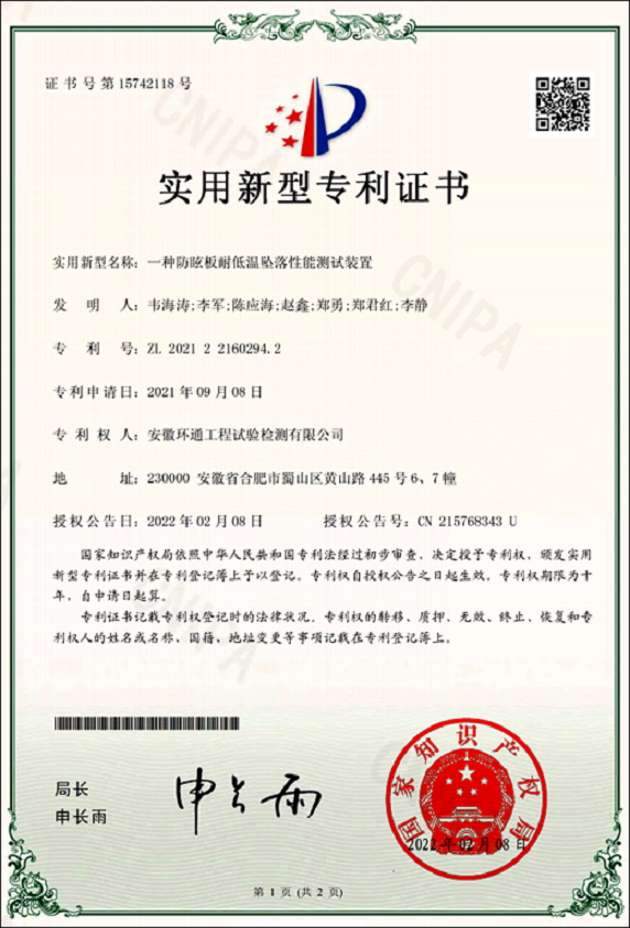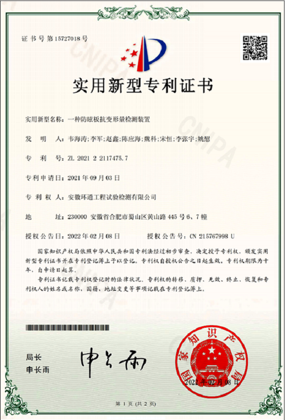Three scientific research achievements of ACEG - “The deformation resistance measurement device for one kind of anti-dazzle board”, “The structure size measurement device for one kind of anti-dazzle board” and “The testing device of falling resistance for one kind of anti-dazzle board in low temperatures”, have all been granted the utility model patent certificates by National Intellectual Property Office recently, the patent holder is Anhui Huantong Engineering Testing Co., Ltd. - a subsidiary of ACEG Road and Bridge Company Limited.